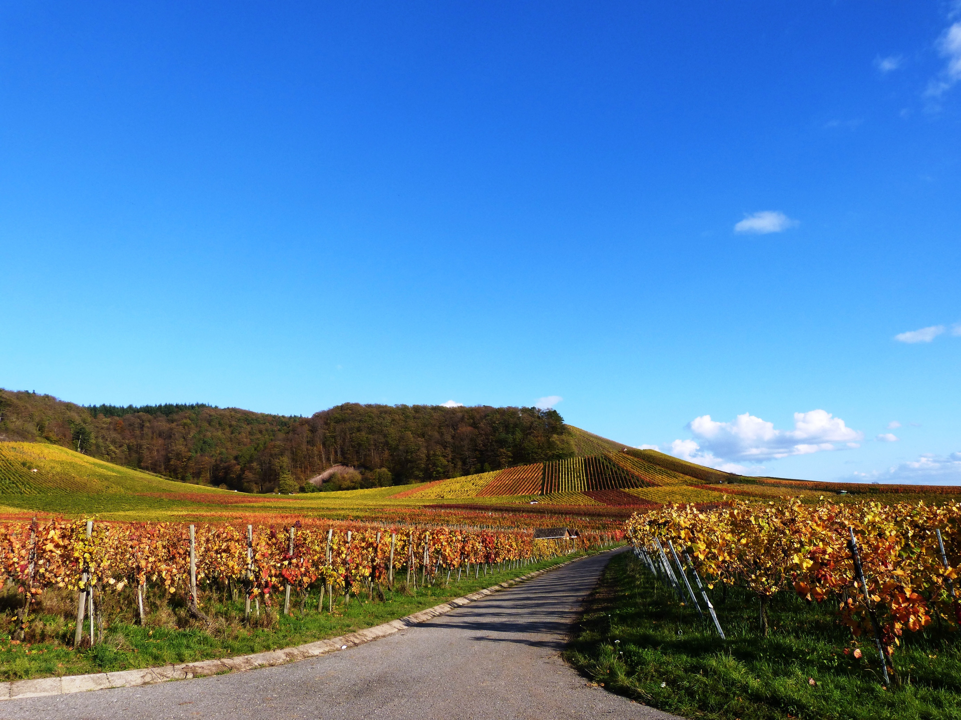 An der T-Kreuzung links, geradeaus über die Kreisstraße, dann bergab ins