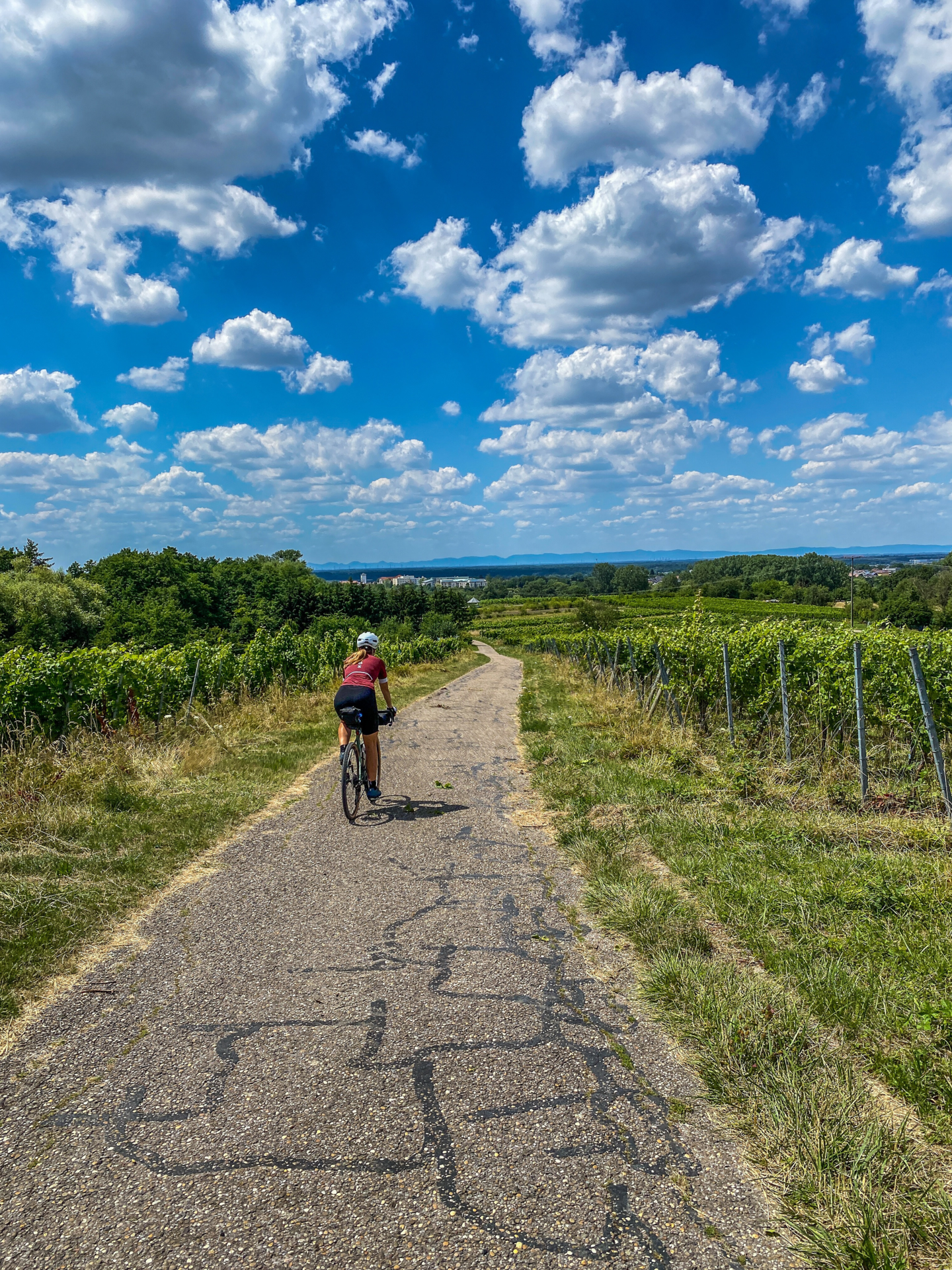 Ist der Schwetzinger Hardt einmal durchquert, gelangst Du auf den Kraichradweg, der sich entlang des Kraichbachs schlängelt und Dich bis nach Bad Schönborn begleitet. Der St. Leoner See kann Deine erste willkommene Abkühlung auf der Strecke sein. Bad Schönborn ermöglicht Dir nach etwa der Hälfte der Etappe eine gute Möglichkeit zum Einkehren. Entspanne Dich im Sole-Aktiv-Park und genieße ein erfrischendes Kaltgetränk im Biergarten des Parks. Weiter geht’s und von jetzt an wird es hügeliger, denn Bad Schönborn ist das Tor zum Hügelland. Über tolle Schotterpisten im Östringer Erlenwald erreichst Du nach der Goldköpfle-Grillhütte eine unserer vielen Hügelsofas, die entlang der Strecke auf Dich warten. Und von hier hast Du das erste Mal eine der tollen und atemberaubenden Weitsichten über Bad Schönborn bis hin zum Nordschwarzwald und der Pfalz. Und nicht nur das, ab hier fangen die Weinberge an, die Dich ab jetzt immer mal wieder entlang der Strecke begleiten.