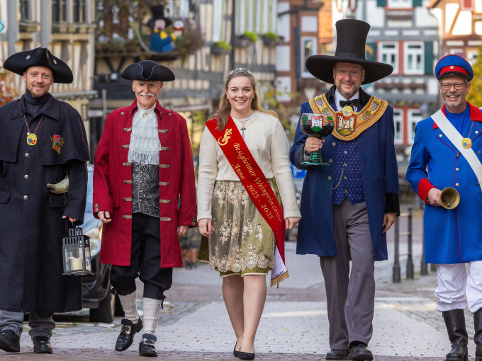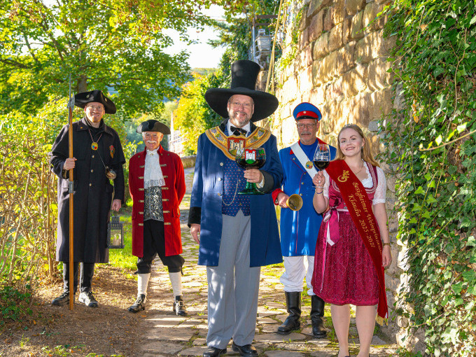 Eine Gruppe von fünf Personen in historischen Kostümen geht eine gepflasterte Straße entlang. Sie tragen Hüte, Mäntel und eine Schärpe. | © Stadt Besigheim