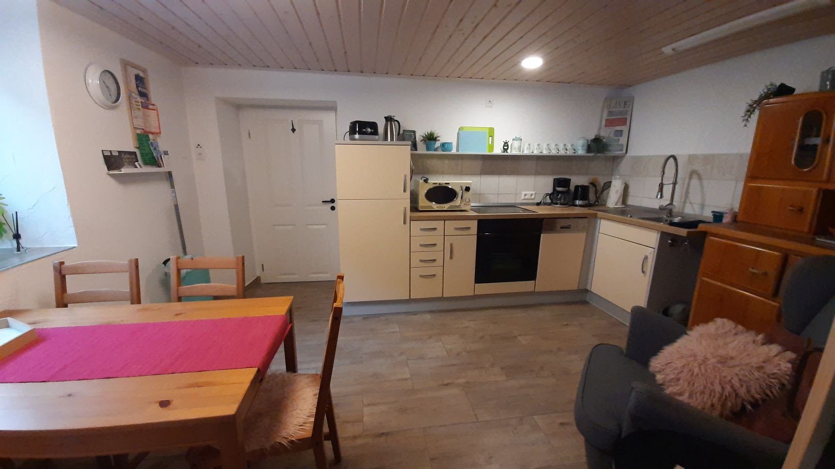 Nichtraucherwohnung, Raucherbereich im Hof vorhanden; 1 Schlafzimmer mit Doppelbett + Schlafsessel, Wohn- Essbereich mit Sitzecke, Sessel, Fernseher, voll ausgestatteter Küche (Kühlschrank mit Gefrierfach, Filterkaffeemaschine, Wasserkocher, Spülmaschine), Waschmaschine, barrierefreie Dusche, Föhn, separates WC
