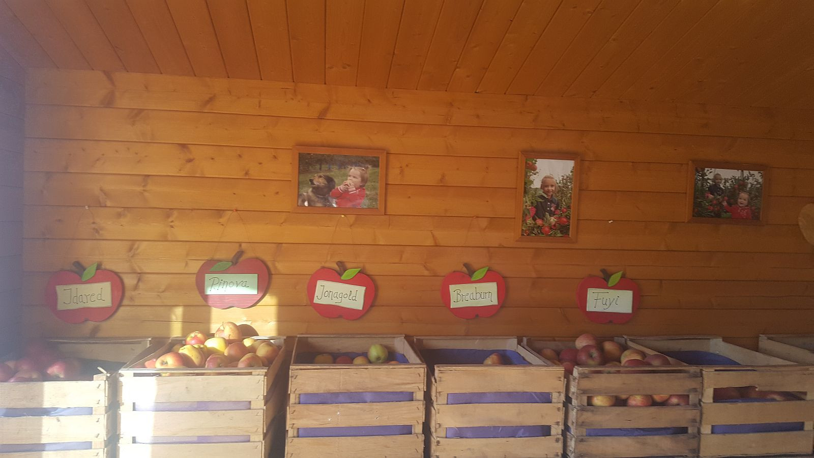 Verschiedene Äpfel, Apfelsaft, Apfelchips, Schnäpse und Liköre aus eigener Produktion.