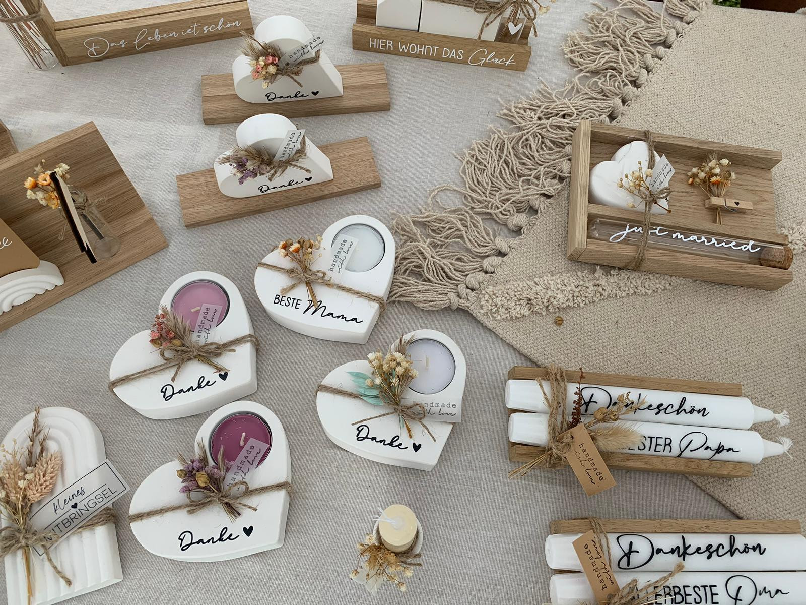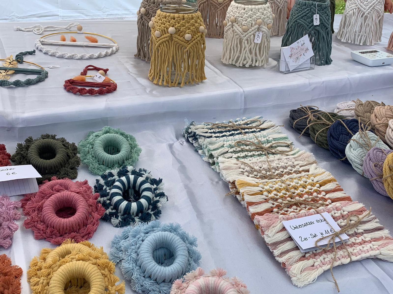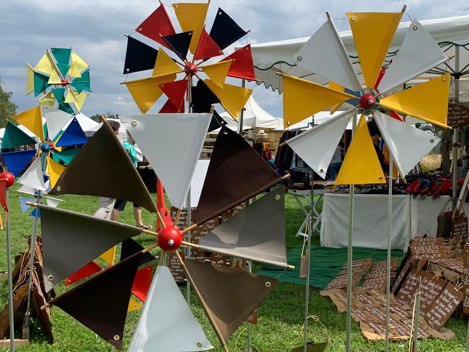 Neben Taschen, Lederwaren, Klangschalen und handgefertigtem Schmuck aus Metall gibt es Hüte in allen Facetten. Strickwaren sind ebenso vertreten, wie Gartendekorationen aller Art.