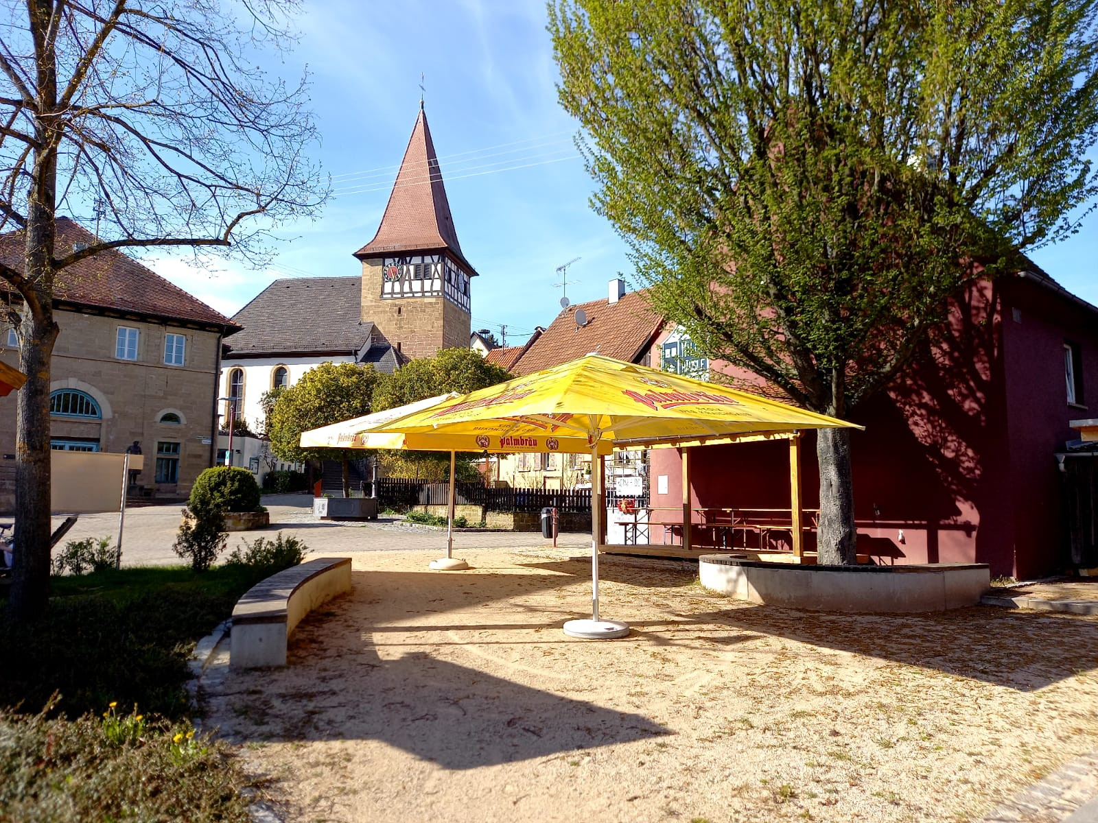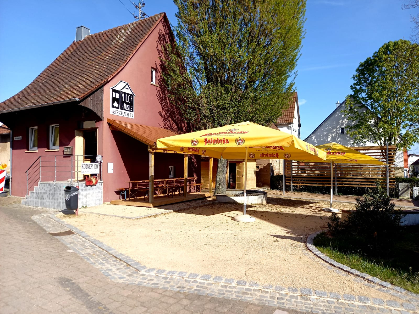 Im Herzen von Haberschlacht wird es regelmäßig gemütlich. Auf dem Platz vor dem Milchhäusle spannen Ehrenamtliche Schirme auf und stellen Biergarnituren raus. Der Milchhäusleverein lädt an ausgewählten Samstagen zum Pause machen ein.