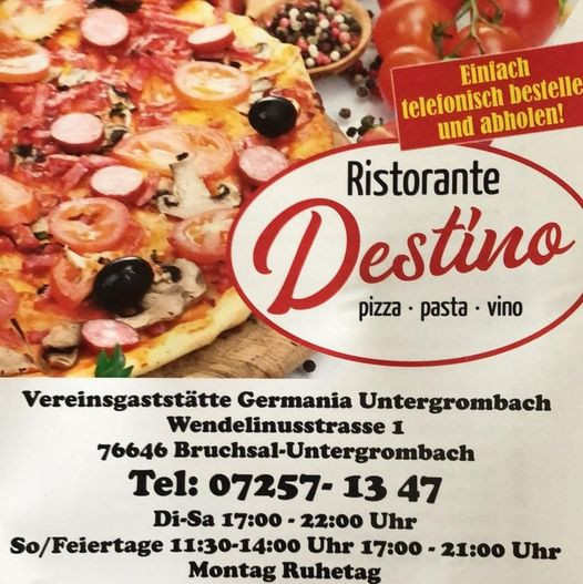 Im Restaurant Destino in Untergrombach erwartet die Gäste Pizza aus dem Steinofen sowie klassische und moderne italienische Spezialitäten. An Spieltagen des FC Germania Untergrombach ist durchgehend geöffnet, während der Öffnungszeiten sind auch telefonische Bestellungen und Lieferungen möglich.
