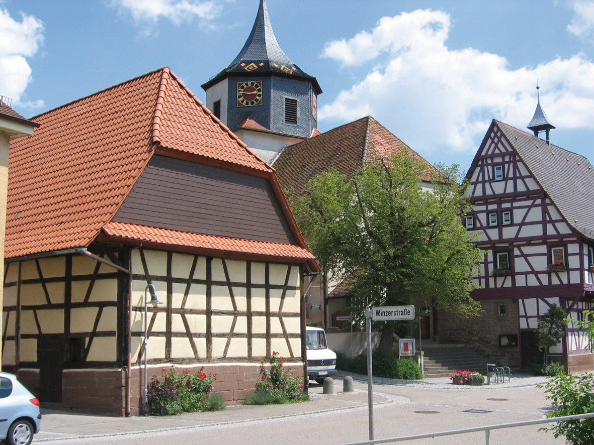 Vorbei an schönen Fachwerkhäusern biegen wir nach der Brünnelesbachbrücke links in die Gündelbacher Straße ein und folgen ihr bis zum Ende des Sportplatzes. Jetzt halten wir uns links und gehen bergauf zum Sportgelände. Übrigens könnte unsere Tour auch hier beginnen, genügend Parkplätze sind jedenfalls vorhanden.