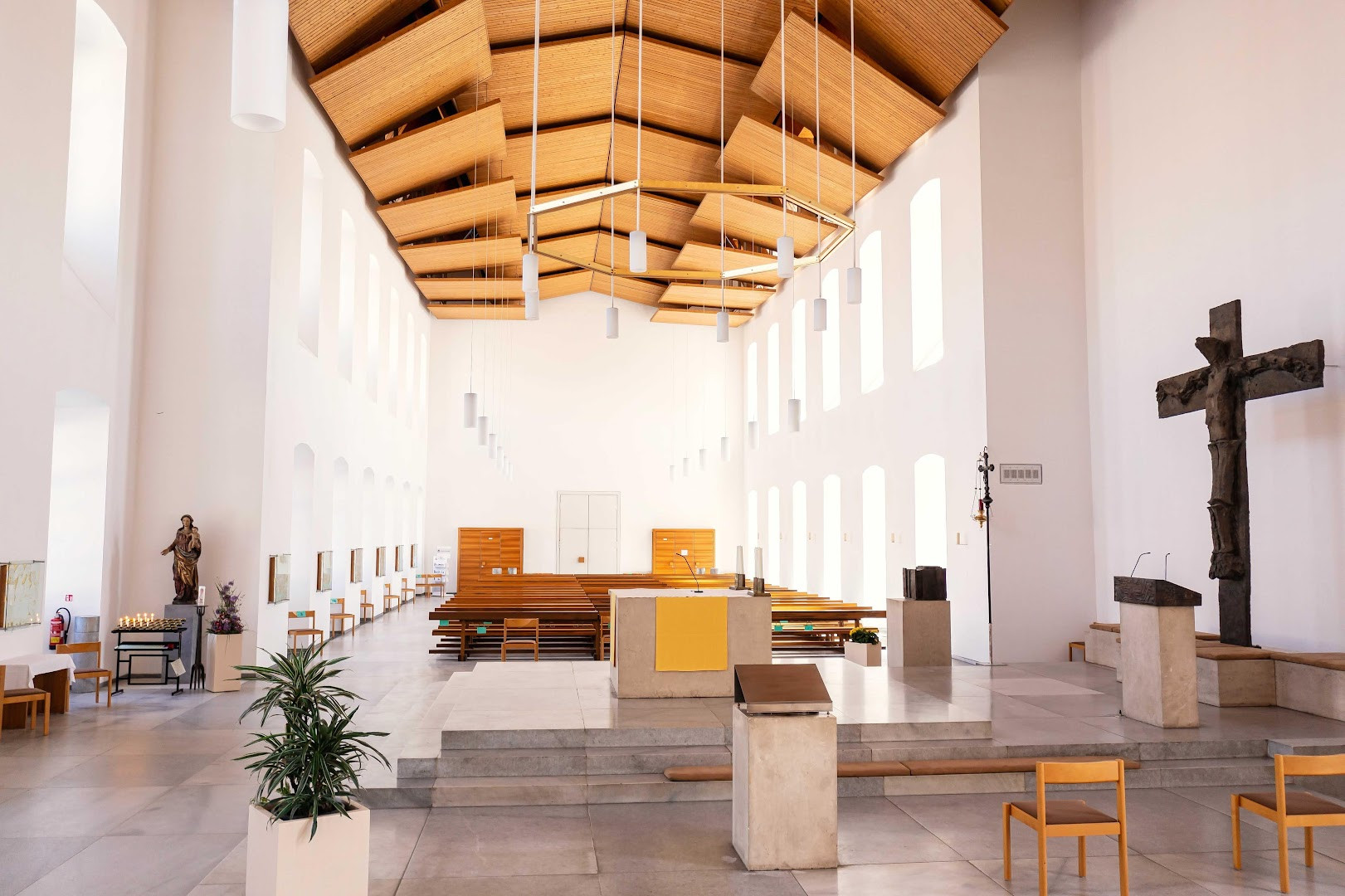 Erst im Jahr 1966 war der Kirchenflügel wieder aufgebaut. Architekt Lothar Götz gestaltete das Innere der Kirche modern und detailreich. Besonders auffallend ist die zentrale Position des Altars und das beeindruckende Bronzekreuz im Altarraum.