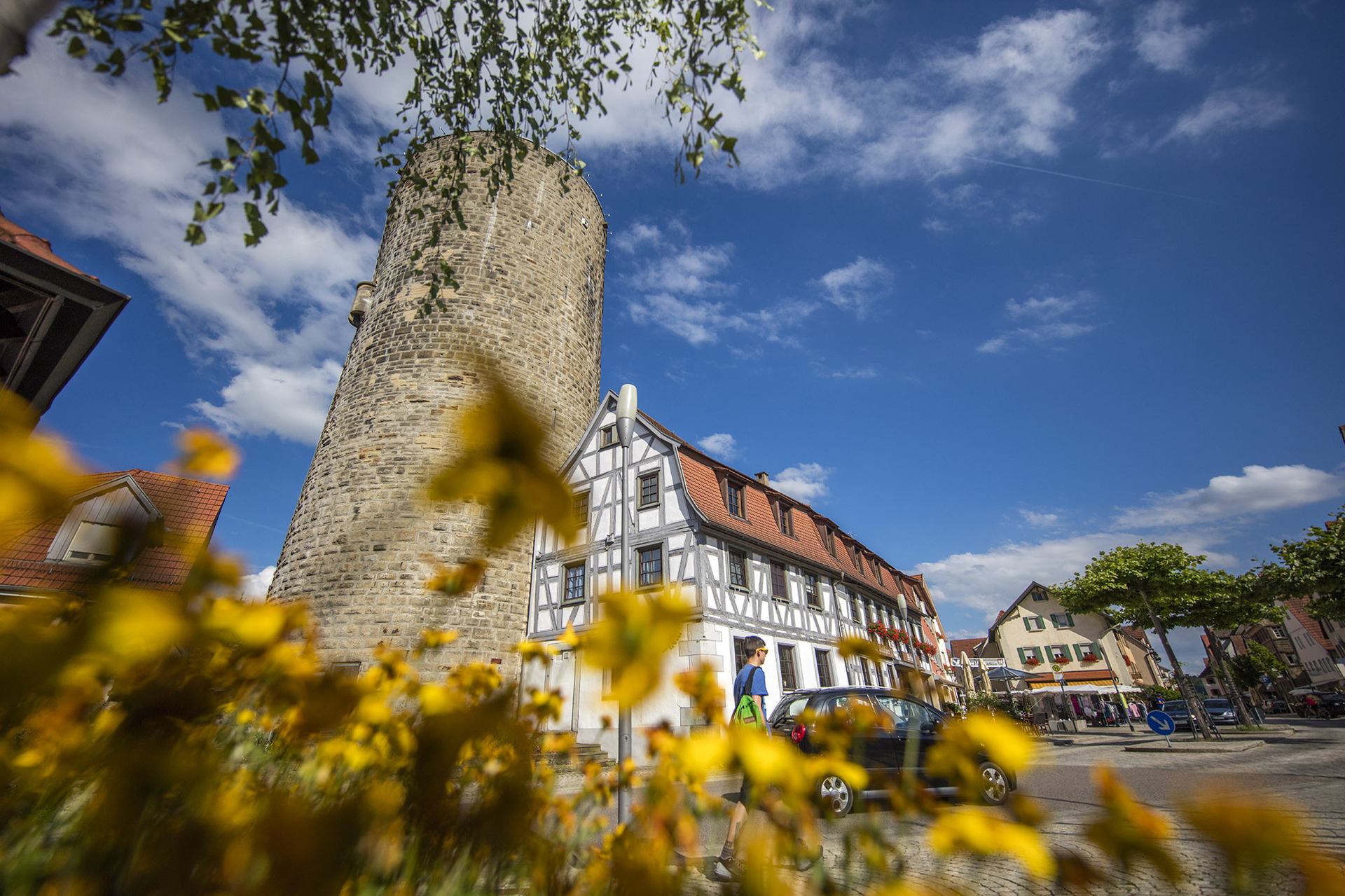 Der Waldhornturm, einer von zwei Staufertürmen, wurde um 1220 erbaut Der Turm ist 29 m hoch und seine Mauern haben am Turmfuß einen Durchmesser von 4 m.