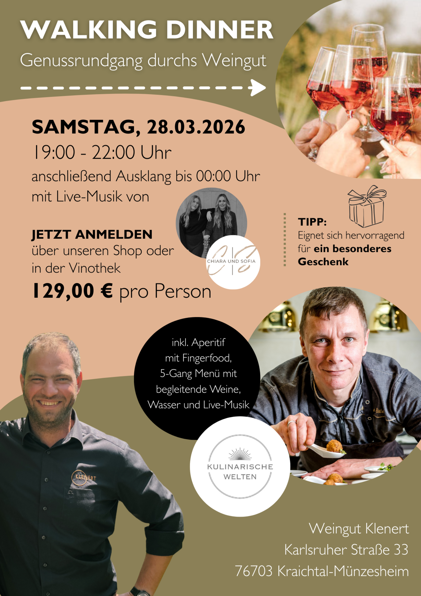 Marcus Böker und sein Team von Kulinarische Welten zaubert euch ein genussvolles 5-Gänge Menü. Daneben erwartet Euch ein Aperitif mit Fingerfood sowie die begleitenden Weine vom Weingut Klenert und Live-Musik mit Chiara & Sofia. Jeder Gang wird an unterschiedlichen Orten im Weingut mit begleitenden Weinen präsentiert. Die Menü’s klassisch und vegetarisch können in der Produktgalerie als weitere Bilder angeschaut werden.