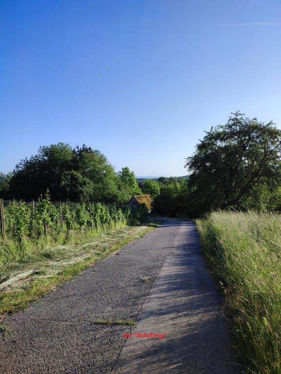 Auf dem Fahrweg etwa 800 Meter dem Metterbächlein und den Holzwiesen entlang abwärts. Dann links am Wasserreservoir "Rohrbergquelle" vorbei durch die Weinberge des Rohrbergs. Der Beschilderung weiter folgend geht es durch Obstwiesen dem Ausgangspunkt in Diefenbach zu.