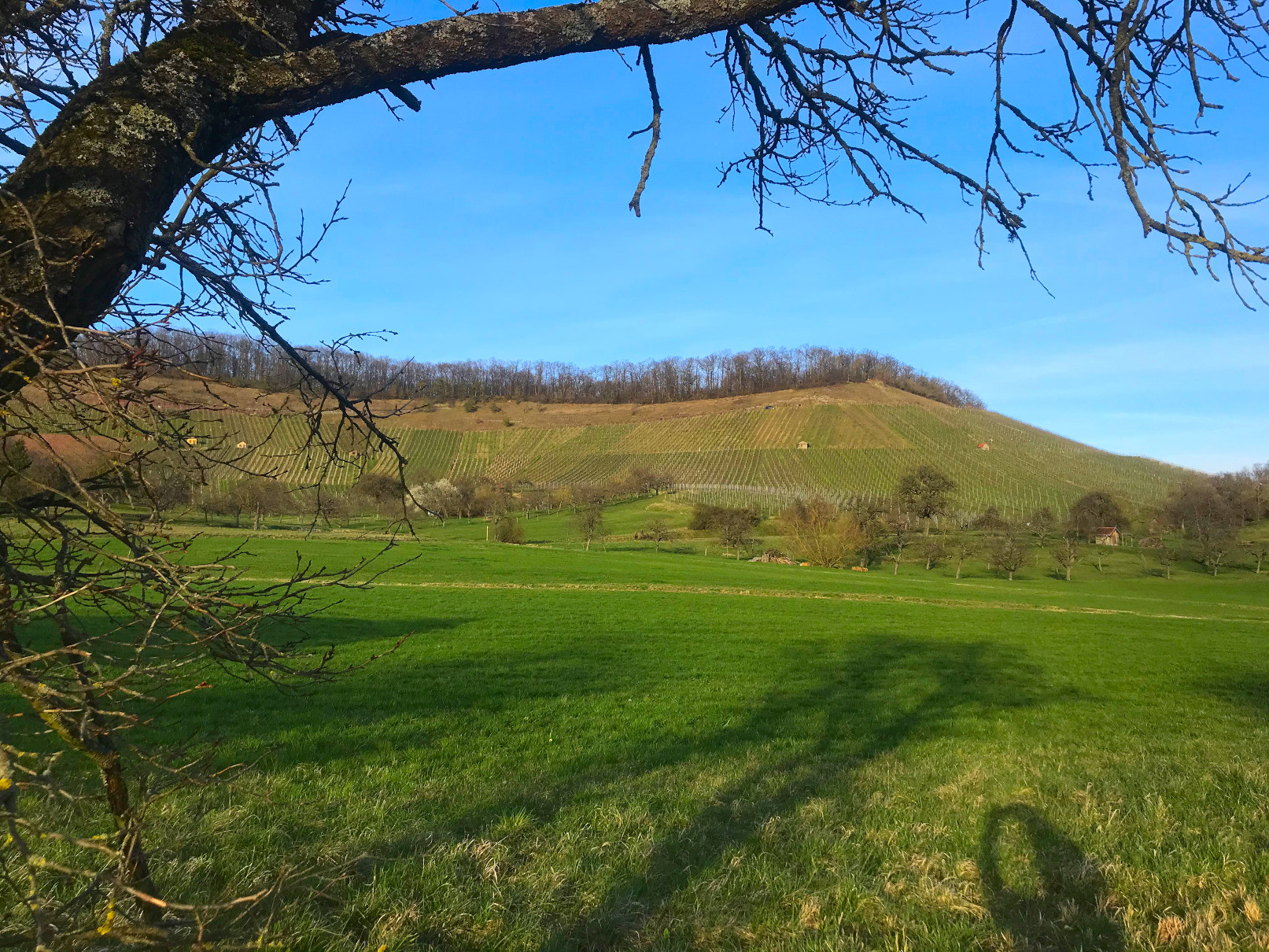 Wieder zurück auf dem Wanderweg lässt man die Fischweiher an der Metter links liegen und nimmt danach den Weg nach links in den Wald. Der Erdweg führt zuerst sanft, dann kurz etwas steiler nach rechts bergan. An der Hangkante angekommen, sieht man schon die Wirtschaftsgebäude des Burrainhofes, der in einer Besenwirtschaft eigenen Wein ausschenkt. Nach der Stärkung in einer der ältesten Besenwirtschaften des Landes tritt der Wanderer den Heimweg an. Auf der Teerstraße hält man sich zuerst in nordöstlicher Richtung und biegt bei dem querenden Teersträßchen nach links ab. Ihm folgt man nun bis zum Ausgangspunkt, während rechts der Ausblick auf die Weinberge des Diefenbacher Königs genossen werden kann.