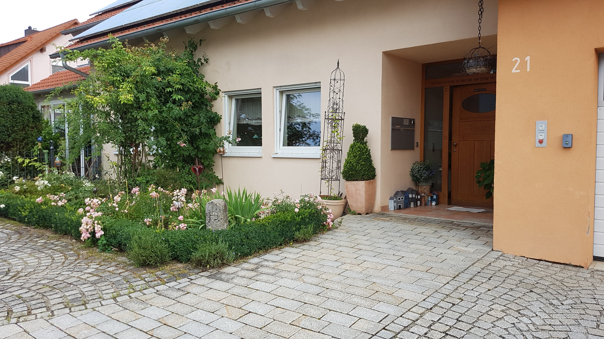 Vor der Wohnung ist eine Terrasse und ein Garten. Die Terrasse mit Garten ist in den Sommermonaten sonnig von 8:00 Uhr morgens bis abends ca. 19:00 Uhr.