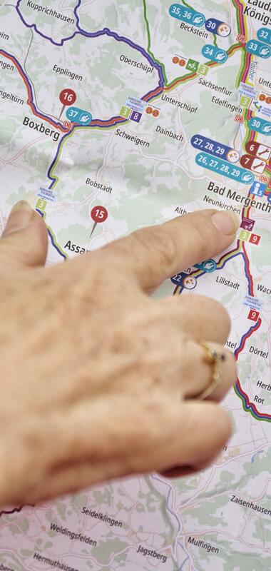 Im Lieblichen Taubertal lässt sich das Radfahren gut mit Bahn und Bus verbinden. Radzüge und Radbusse ergänzen deine Tour und erweitern den Radius – entlang der Tauber, hinein ins Vorbachtal oder bis nach Rothenburg ob der Tauber.