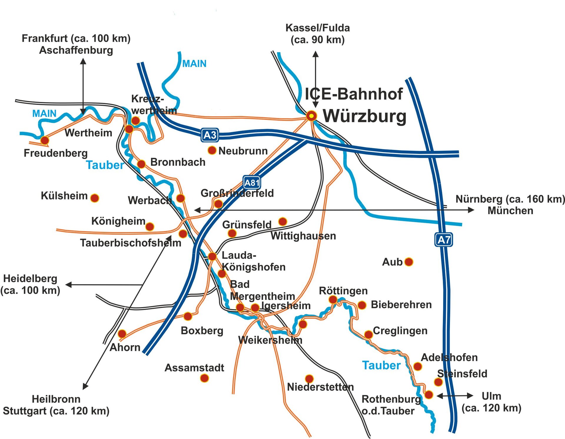 Bahnreisende gelangen überregional bequem über den ICE-Bahnhof Würzburg ins Liebliche Taubertal. Deine überregionale Anreise kannst du außerdem über die Deutsche Bahn planen.