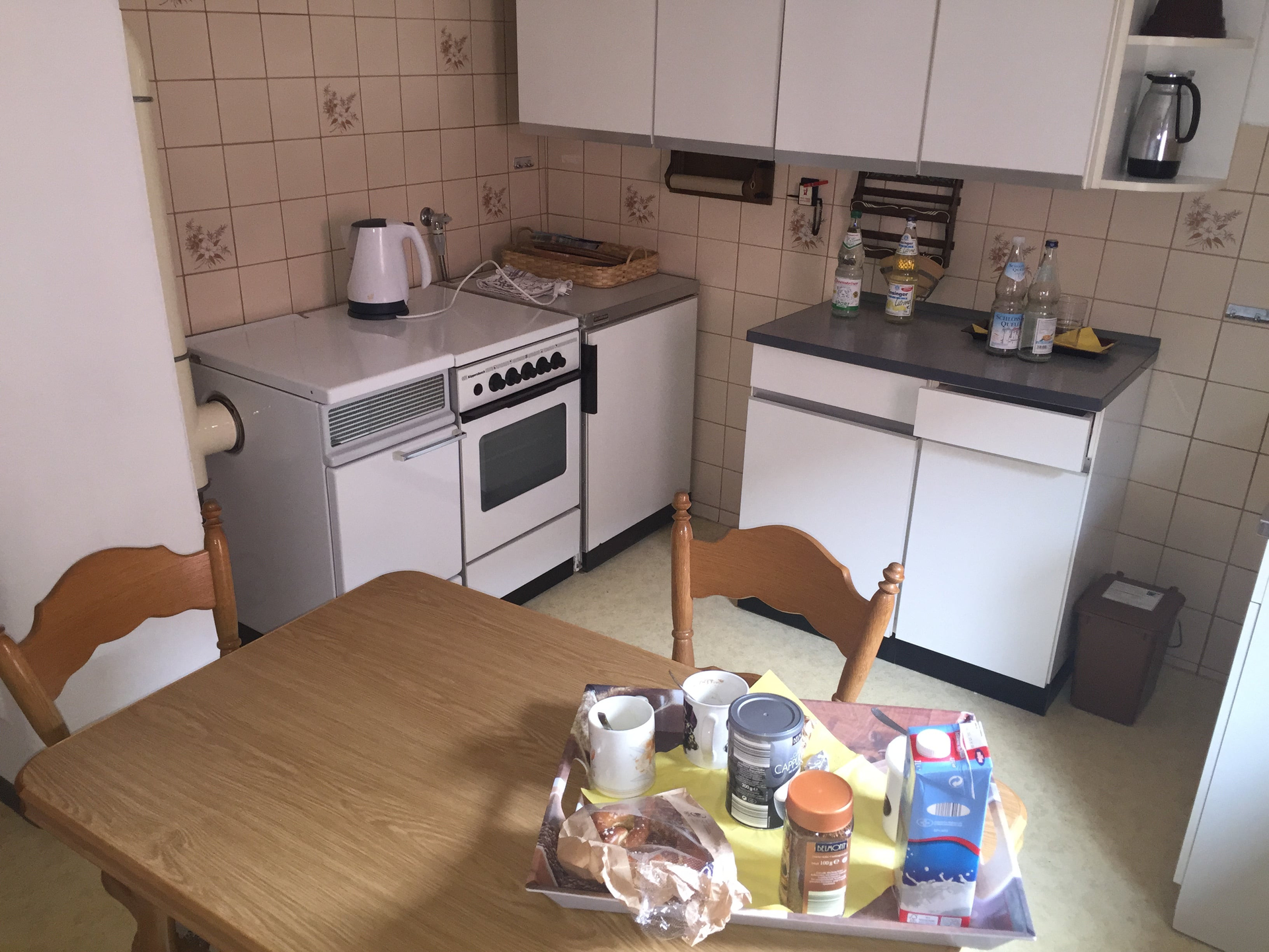 • Einbauküche mit Herd, Cerankochfeld, Mikrowelle, Kühlschrank, Gefrierfach, Wasserkocher und Kaffeemaschine