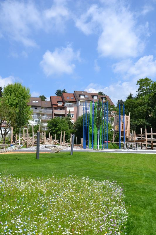 Zahlreiche Spiel- und Sportgeräte für jedermann, Sitzmöglichkeiten und überdachte Spielmöglichkeiten laden zum Verweilen ein. Erholsame Parkatmosphäre direkt an der Elsenz.