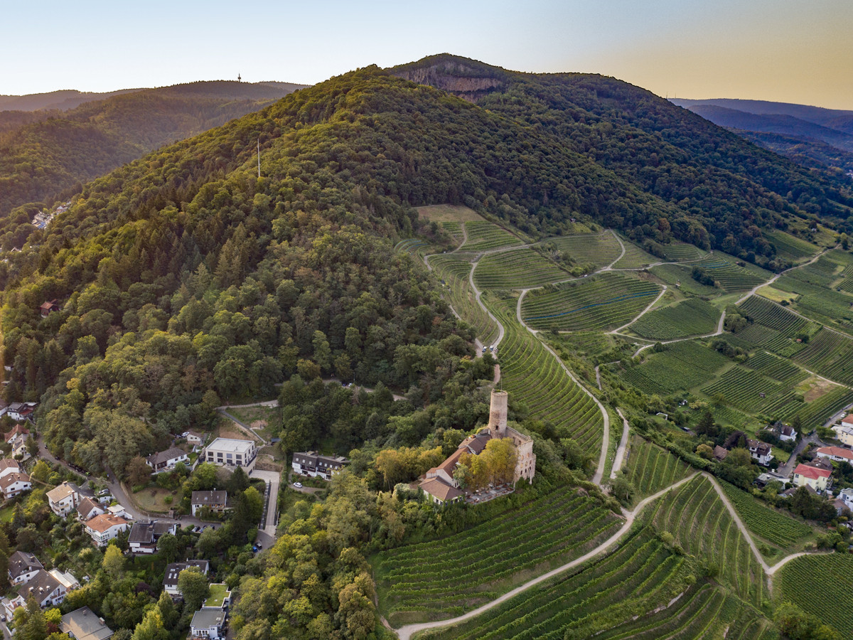 Nach einer Rast am Liederkranzdenkmal oder einem der Plätze an der Burg geht es durch die Weinberge hinab zum Etappenziel, der Straßenbahnstation Schriesheim.