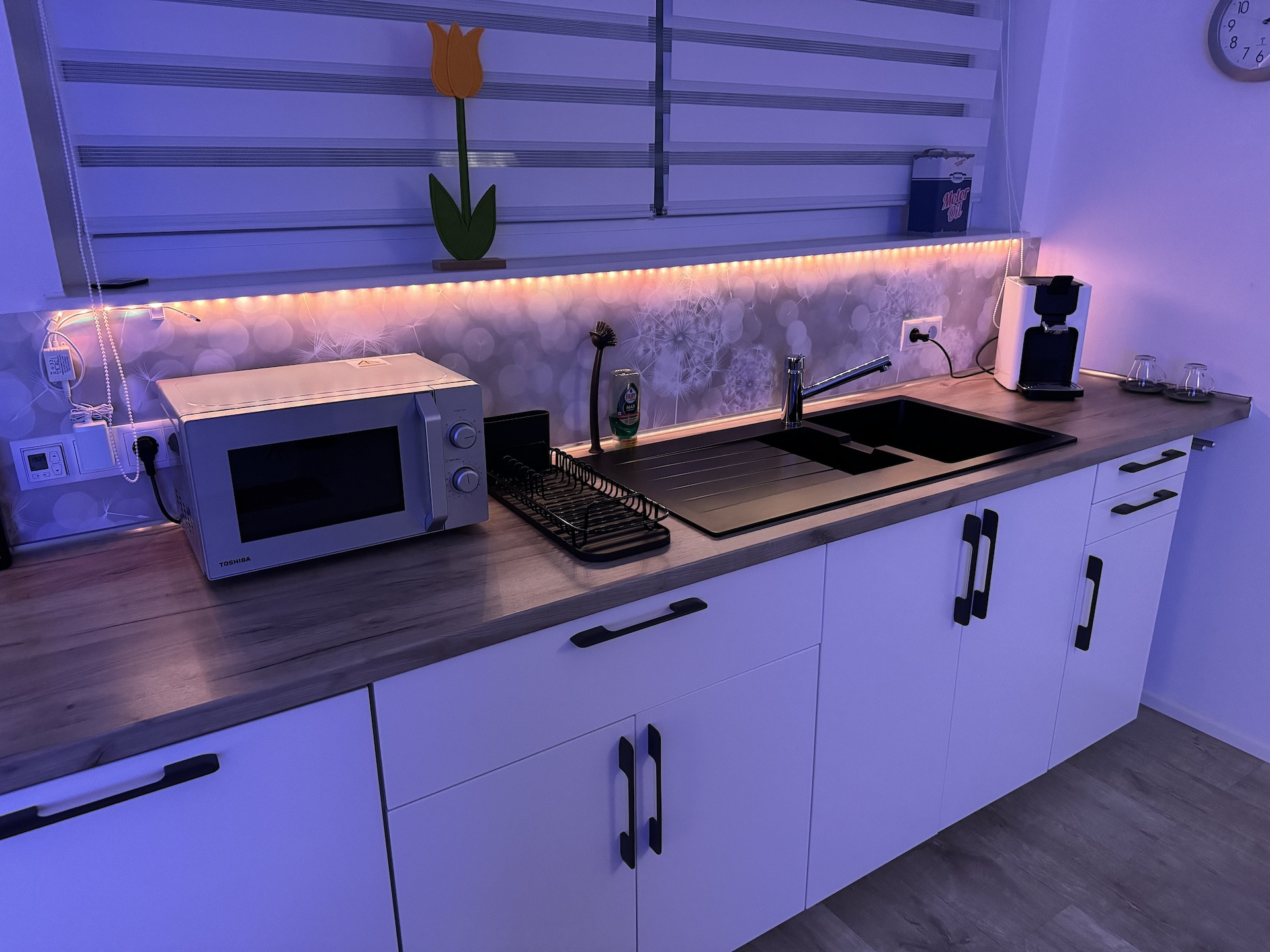 Die Wohnung verfügt über ein großes Wohn-/Esszimmer mit gut ausgestatteter Küchenzeile.