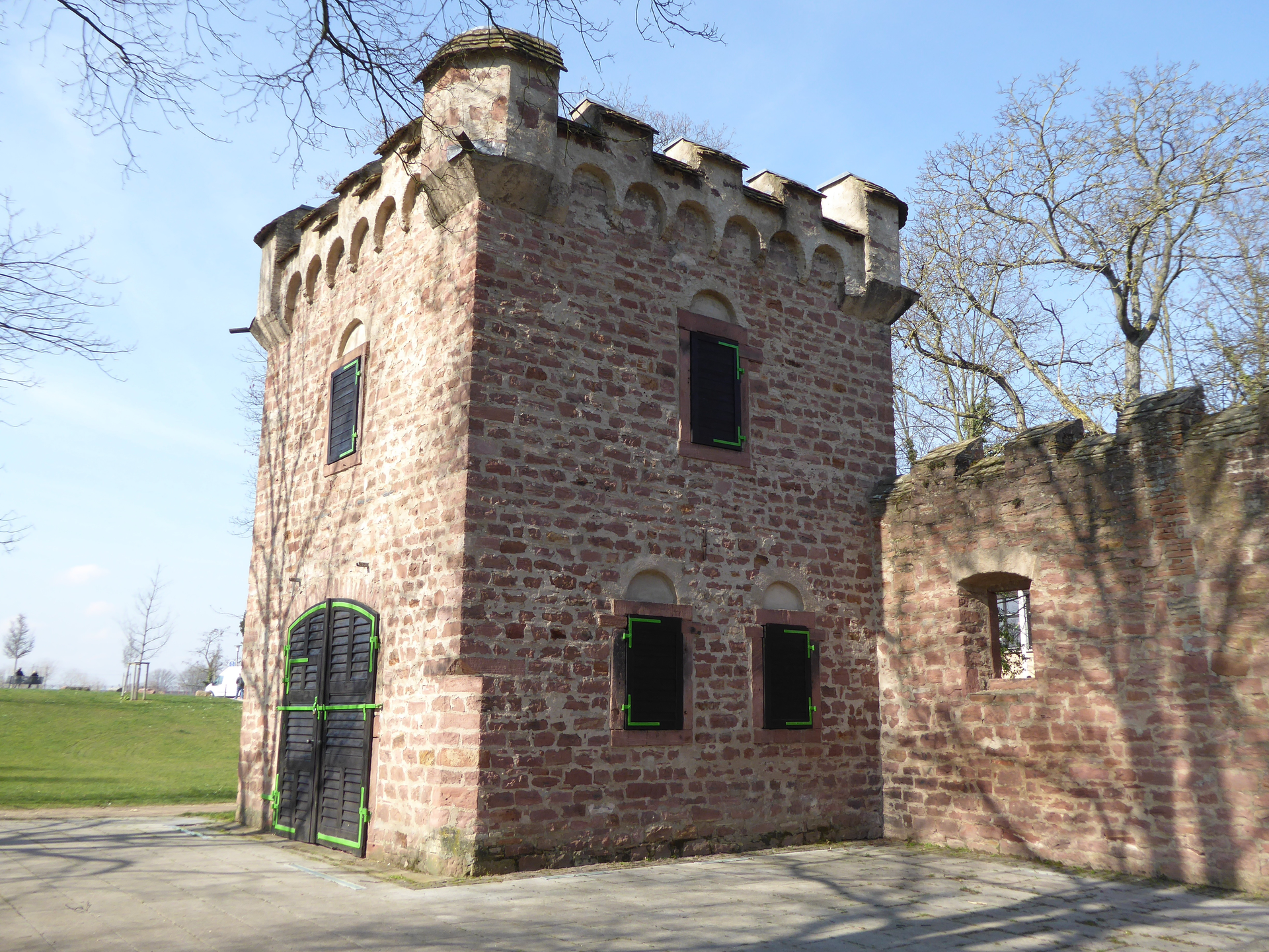 Im Park des Wohnhauses von Dr. Carl Benz wurde in Gestalt eines Wehrturms ein Gartenhaus errichtet, dessen Untergeschoss als Autogarage diente.