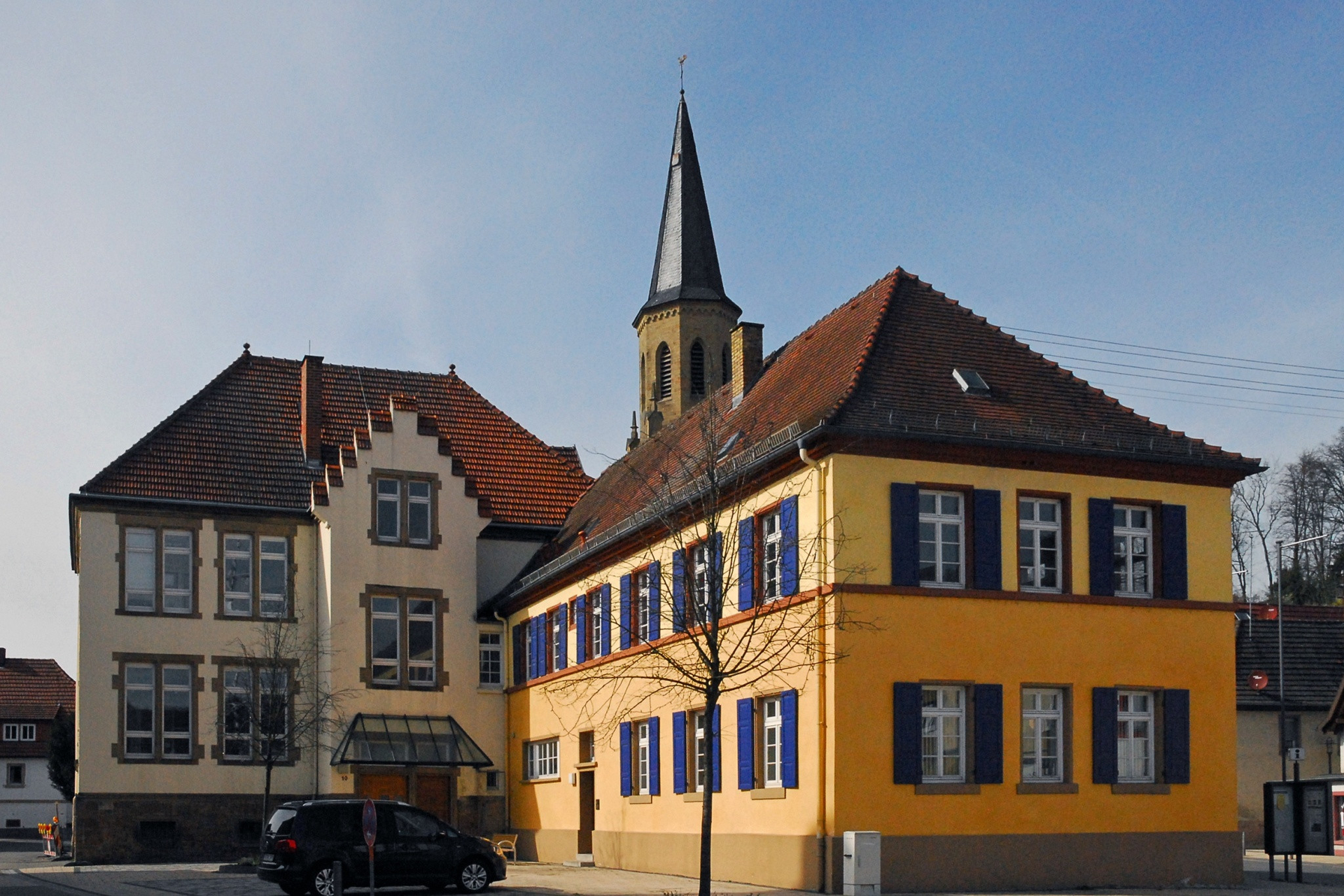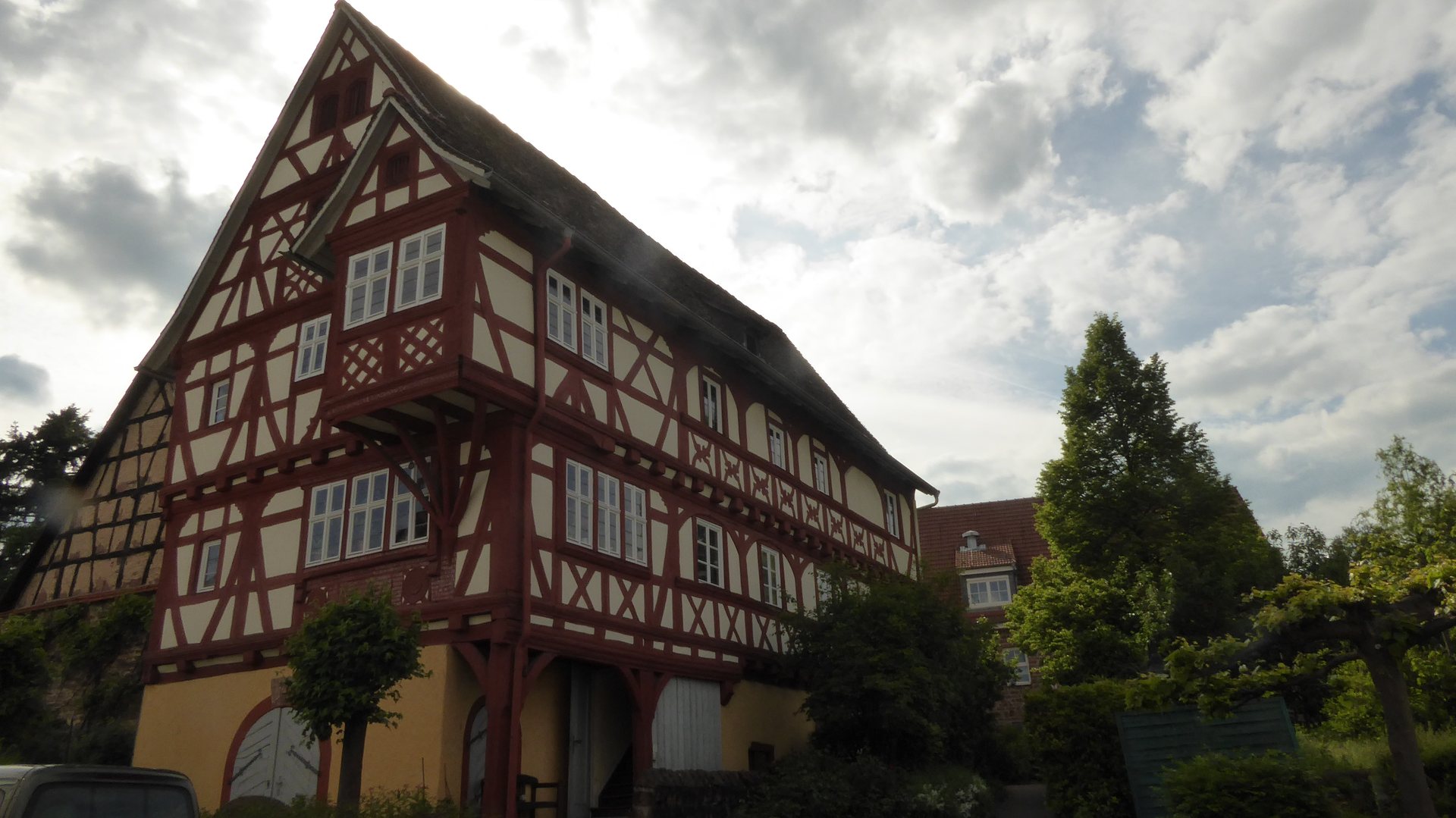 Wir kommen nach Schatthausen. Hier steht ein schönes Wasserschloß das sich noch im privaten Besitz befindet. Dieses Wasserschloß wurde nach 1562 durch die von Bettendorff vemutlich an der Stelle eines früheren Herrensitzes errichtet und danach mehrfach umgebaut. Das Schloß ist noch von einem intakten Wassergraben umgeben. Zum Schloßgut zählten einst ein Wirtschaftshof sowie eine Mühle. Die Mühle wurde 1487 erstmals urkundlich erwähnt und wurde vom Ritter Nypperg einem Peter Müller übergeben. Leider ist nur noch das große Mühlrad erhalten.